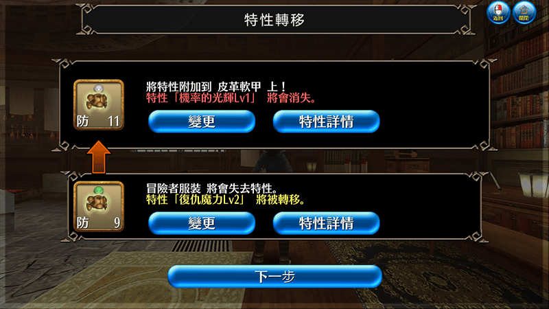 「鐵匠鋪 > 裝備強化 > 特性轉移」使用。