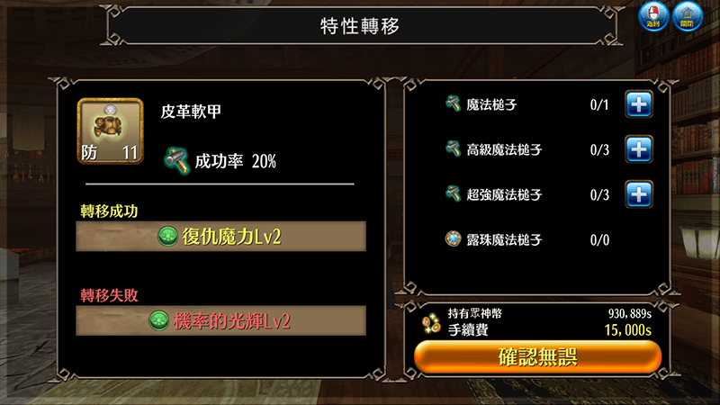 可以將高等級的「機率的光輝」附加至想轉移特性的裝備,提高轉移的成功率。