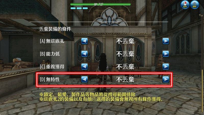 「自動丟棄道具」功能可調整「特性」相關道具設定。