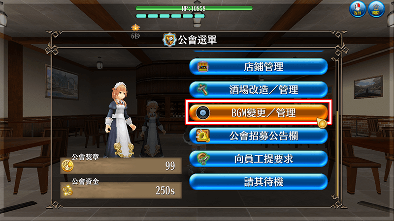 公會選單 >「BGM變更/管理」即可變更公會酒場的BGM,或解鎖新的BGM。